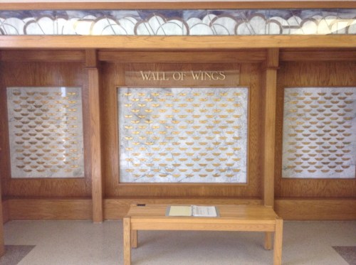 The wall of wings is beautiful the floor has the representative mark of the “99's” pin (minus the propellor) and the stained glass detail done like clouds is a gorgeous dedication.
