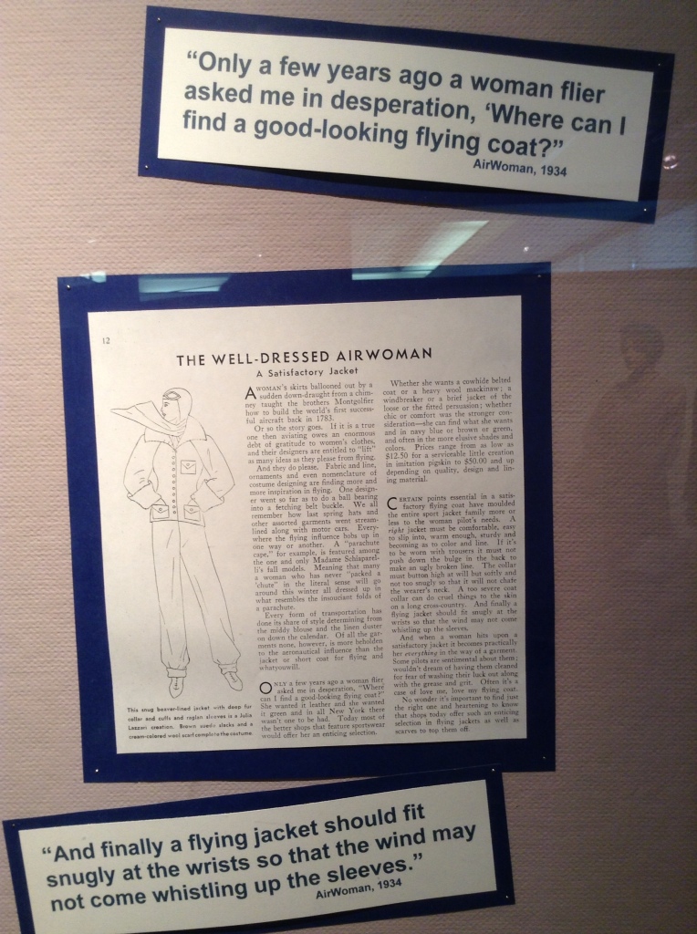 A few of the women went on to design appropriate women's flying clothing, like flying suits, jackets and luggage (Amelia Earhart) and the “Foltz-Up” (Edith Foltz), a skirt that folded up into a tunic top whilst flying and then could be quickly converted back to a skirt over your britches when you disembarked from the plane!