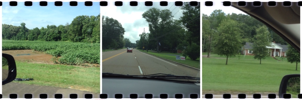 We're taking the 64 he says, despite being slower speeds, this is beautiful – green, green as far as the eye can see. Fields of corn and not sure, but may be cotton, it's wet enough for it. (Cotton or soybeans)