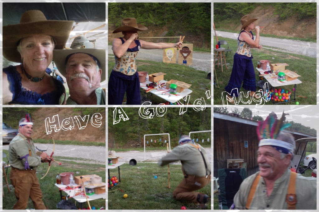 Game 3 – then go a round with Hilary and Obama caricatures. Take your bow and arrow and shoot through their smiles, then ‘chunk coal’ through their smiles. Oh and you had to wear an Indian head dress (feathers in an elastic band, fruit of the loom off yer underpants!) and have an Indian name, so mine was Fanny Fosters Walkabout from the Crackatinni tribe!