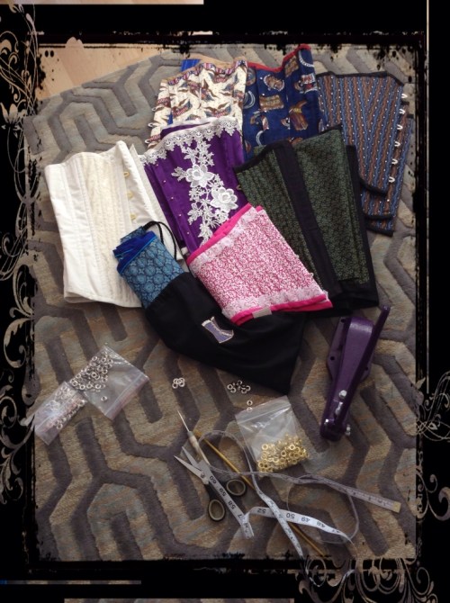 This time it's been some fun cotton ones, some blinged, some not. One for under a custom gown. A gorgeous royal purple satin delight to go back to Texas for the rest of the outfit to be made by it's owner. Two underbust corsets with matching outfits for a local buckarette shooter and a green and black silk to head off to It's owner in New Zealand.