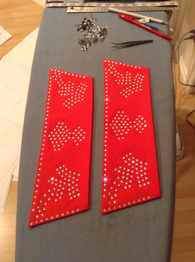 And the bling!? Well, there are 688 rhinestones on the 8 patterns on the split skirt (not including the fringing yet), 406 rhinestones on the 2 cuffs and 1520 rhinestones on the fringing for the sleeve seams!! Phew!