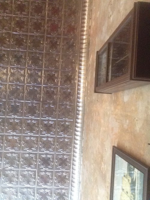 The walls seem to be the original, some of the pitting in the concrete might indicate they have taken off some of the previous fixtures and the ceiling is pressed tin.