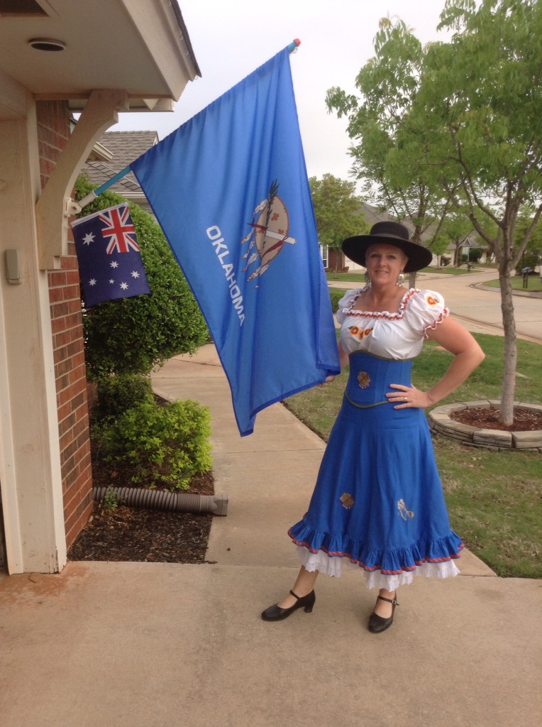 I went all Oklahoman Thursday! My skirt and corselet have the Oklahoma flag symbol and side panels feature the state bird, Scissortailed Flycatcher with the original state flower of Mistletoe. My top has Indian Blanket wild flowers on it.