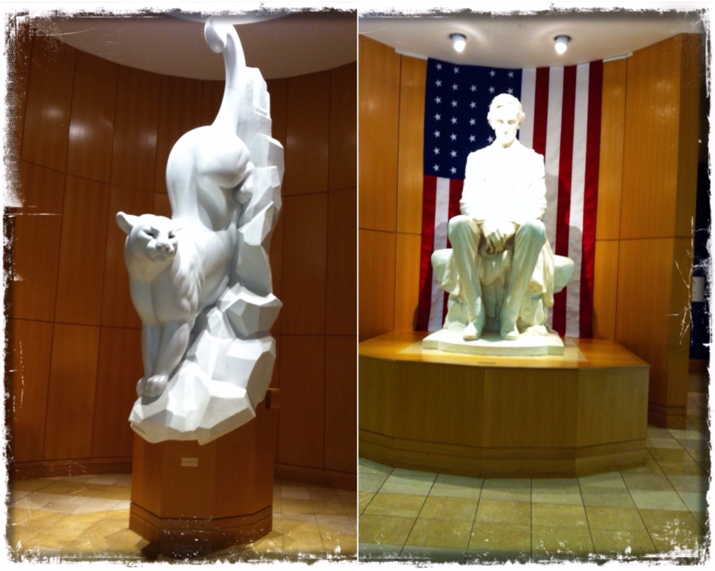 At opposite ends you have the marble 'Canyon Princess' to the right wing and 'Abraham Lincoln' seated in the left wing, round towards the banquet hall.