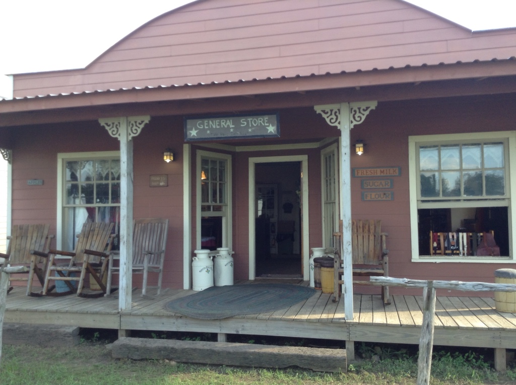 The blacksmith with anvil on a stump out front, horse stalls inside and all.