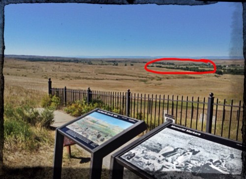 Down in the valley, along the Little Bighorn River (noted with the red circle in the pic) was where the Indian encampment of 6-8000 were. Of these around 2000 were Indian warriors.