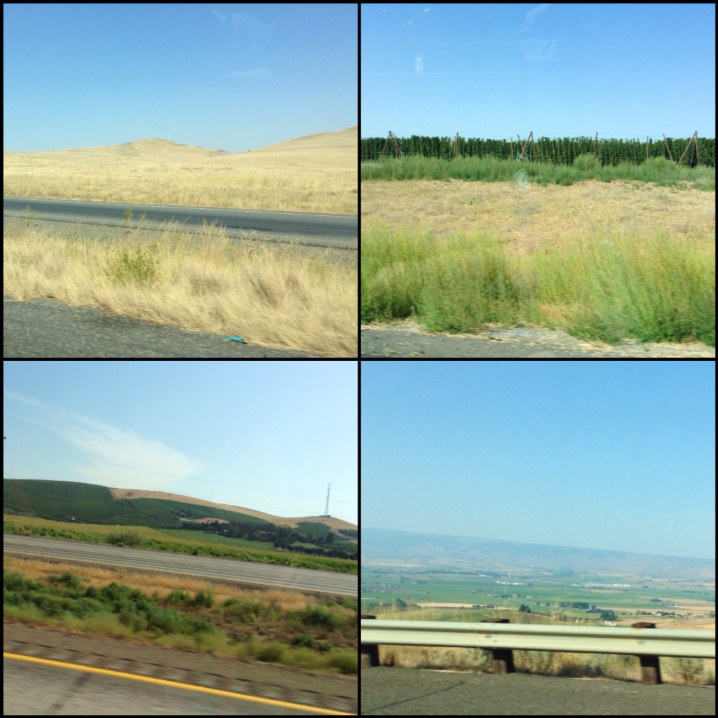 But soon these rolling brown hills turned into valleys of green and more green! As we entered into Grandview and other towns – for miles and miles there are vineyards and orchards! This wine and fruit country.