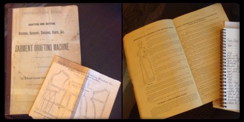 Back to the drafting machine. The set has the original booklet explaining use and details in obtaining correct measurements. It also has the original measurement book, where a seamstress might take down a clients measure – there are measurements written in a delicate script inscribed within the pages of the book!