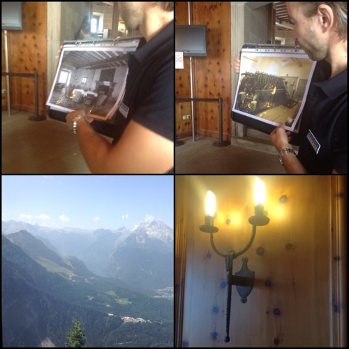 At Kehlsteinhaus, the great hall had a huge picturesque window made up of 90 panels of glass with a marble desk across the full window. The window was also hydraulically lowered into the basement (and raised) for uninterrupted views to the mountains. Half of the mountain range is in Germany and the other half in Austria.