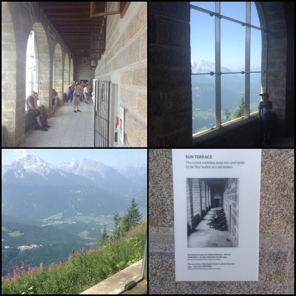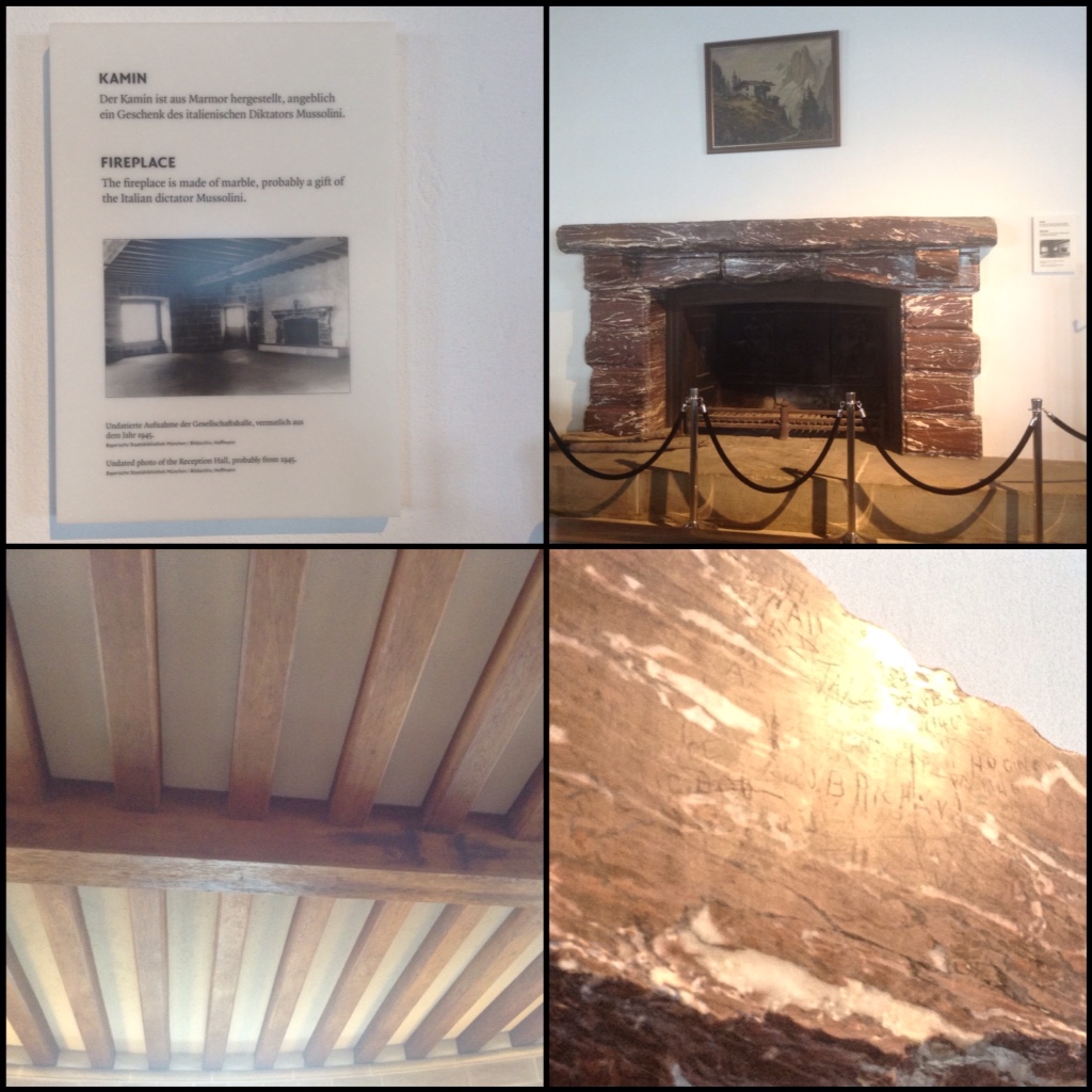At Kehlsteinhaus, the great hall had a huge picturesque window made up of 90 panels of glass with a marble desk across the full window. The window was also hydraulically lowered into the basement (and raised) for uninterrupted views to the mountains. Half of the mountain range is in Germany and the other half in Austria.