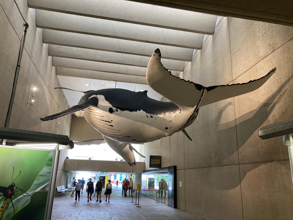 Walking through the entrance from the art gallery and beyond there is a spectacular whale display overhead and dinosaur bones inside.
