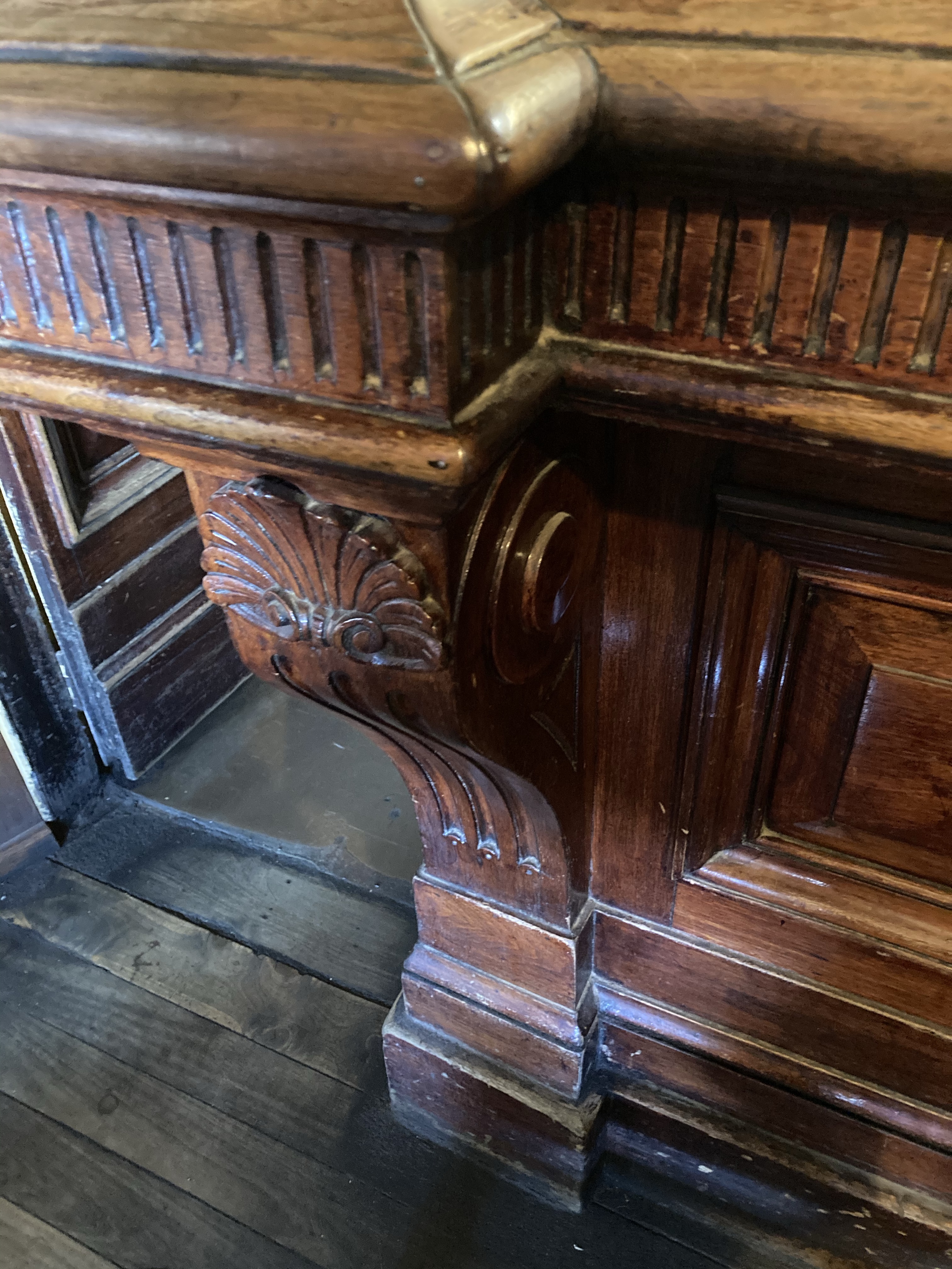 Stairs to the rooms above, fireplace in the bar and beautiful turned work on the bar.