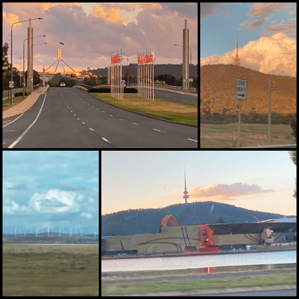 From top left: the nations capital, Parliament House, the needle as its affectionately called, Telstra Tower, needle and art gallery and the wind farm you’re having when you’re not having a wind farm at Lake George. Yes no lake either 😉