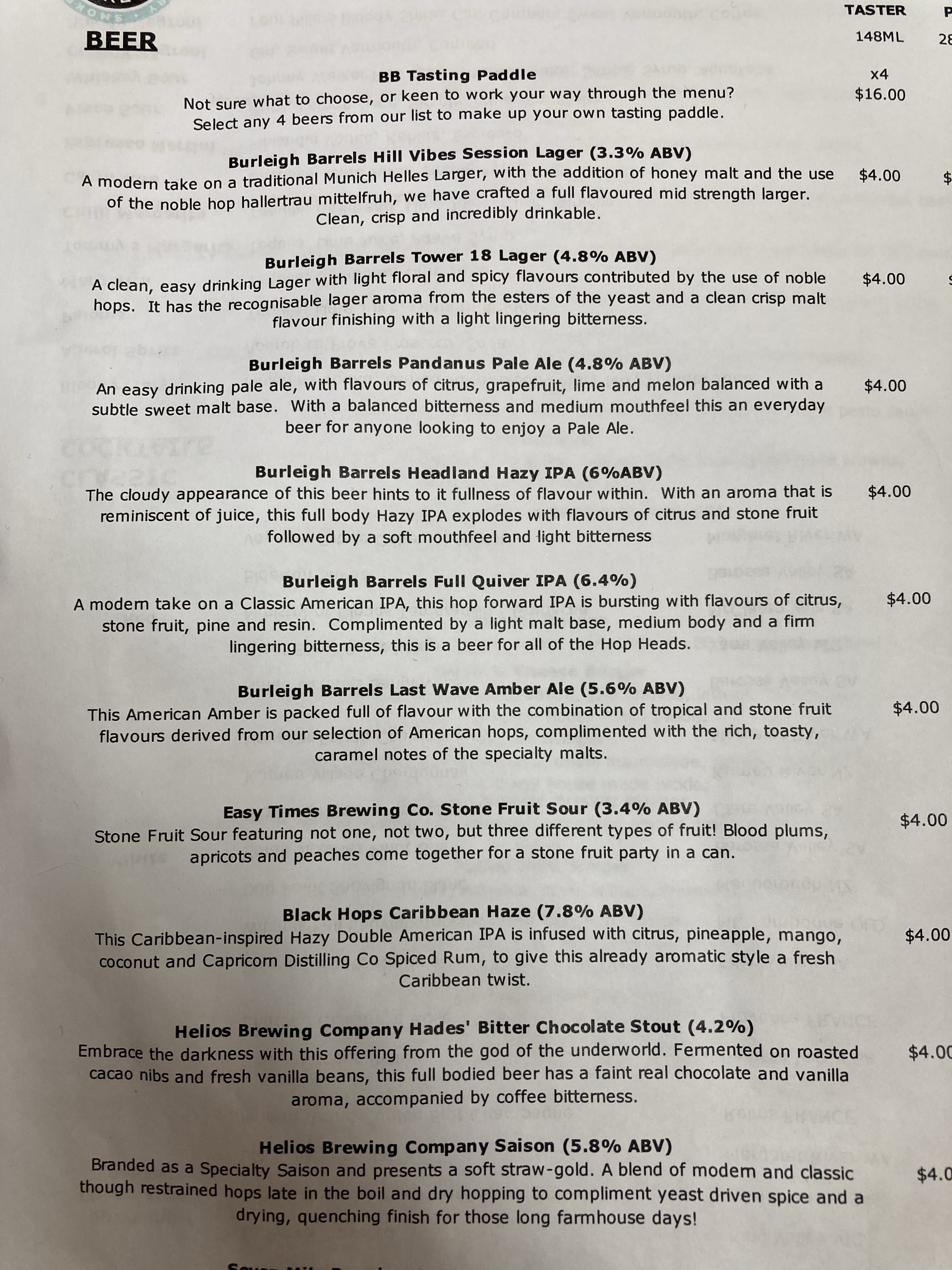A quick stop to a very busy Burleigh Barrels for a beer paddle of Tower 18 Lager, Pandanus Pale Ale, Last Wave Amber Ale and a Headland Hazy IPA. Jack’s pick was Tower 18 and I have to say I enjoyed the IPA the most out of all of them.