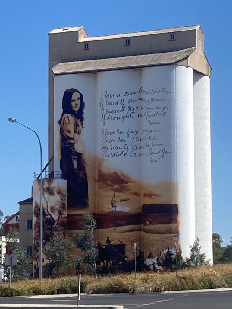 I love the silo art here in our western regions but woke to miss the photo opportunity for the water diviner set. Certainly didn’t miss this one as we got back to the highway – a beautiful portrayal of Dorothea Mackellar’s ‘I love a sunburnt country’.