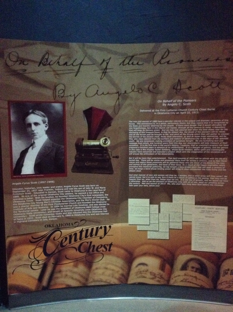 The Century Chest was quite unique and interesting to see. It was a large copper chest that was placed in the floor of the First Lutheran Church in Oklahoma City on April 22, 1913. It was dug up and opened April 22, 2013.
