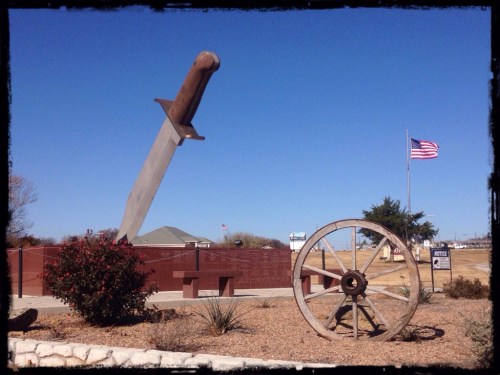 After a hearty breakfast this morning we headed back to Oklahoma via Bowie, Texas. As we stopped to take pictures of the big Bowie knife, police are helping wrangle a wayward steer across the top end of the park, without too much success it seemed. Was a funny sight, watching them run across the park!