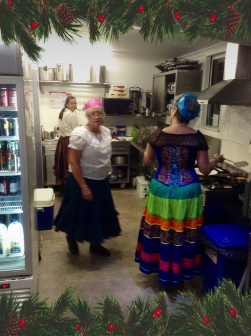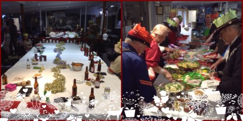 'O come all Ye faithful' inside for the rest of the festivities. We all gathered for the after party with the Budweiser flowing and the chatter getting more animated. A spectacular feast as always prepared by Mrs Claus and her elves (aka Trixie, Prairie Joy and OK Carrol), full of ham, chicken, egg, potato, watermelon salad, prawn and mango salad followed by scrumptious tarts, cheesecake and pavlova! Well done ladies, well done!
