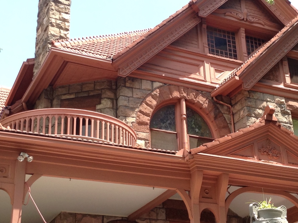 The second floor and sunroom are again all lined in the gold painted paper. Beautiful stained glass windows held a view to the Rocky Mountains no longer seen due to the buildings in the city now. There was also a small balcony that Margaret would have a band play for her visitors.