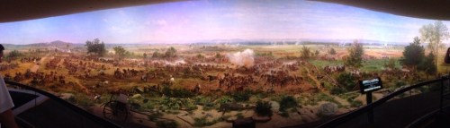 A spectacular vision of sound and light, as if you were standing behind Union lines. It is the largest oil painting in America. Painted in 1884 by Paul Dominique Philippoteaux, it came to Gettysburg in 1913.