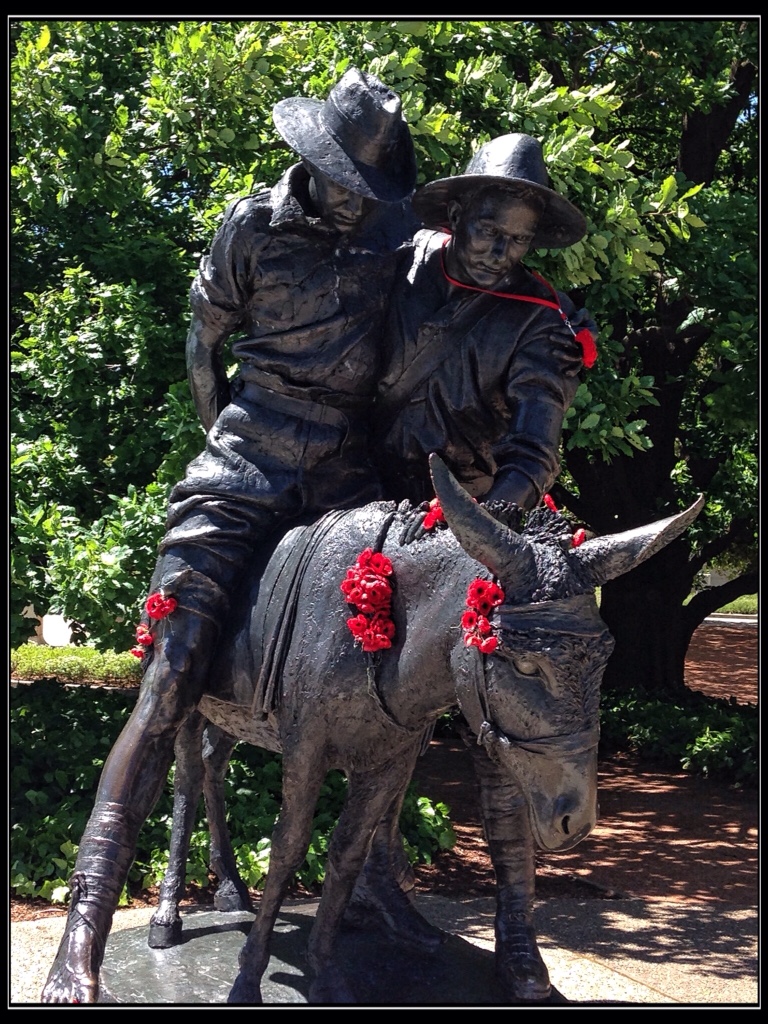 Simpson's donkey is covered in red poppies from the previous day's memorial service. A bronze tribute to John Simpson Kirkpatrick. Recognised for his bravery and compassion, he and his donkey carried water up to troops through Shrapnel Gully and many wounded soldiers back down to Anzac Cove.