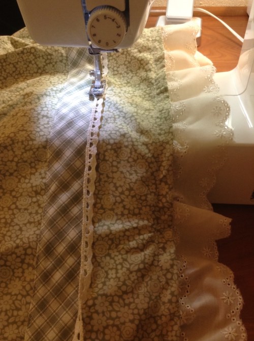 Green and cream. Tea dyed lace and broderie anglaise pair well with this green floral of Annie Hicock's.