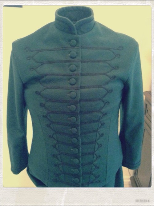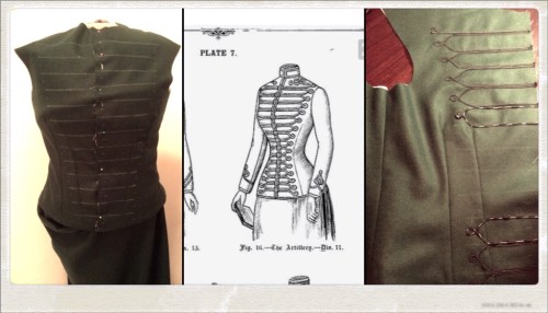 Riding habits (as mentioned in the Truly Victorian pattern) were 'severe' in look and usually had no trim. I did however, find some old photographs of some with the military style braid work, so this is what we went for to add a little character at least.