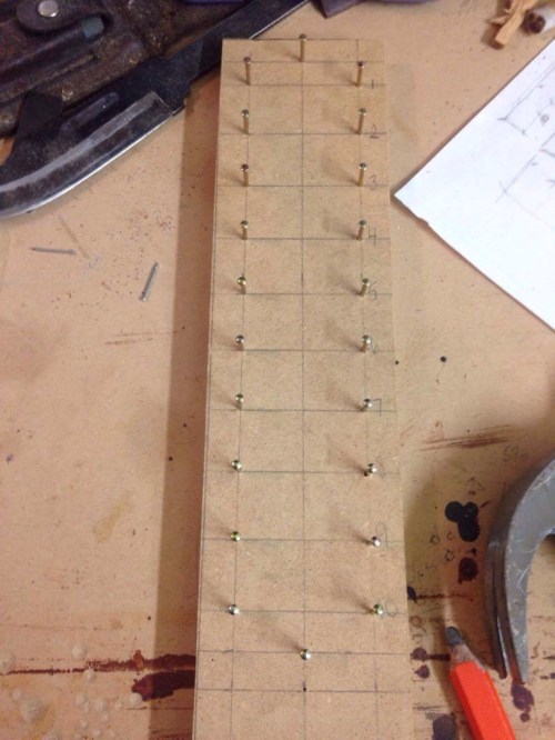 Step 4 – nails, find nails, yep, hot enough. Hammer nails in to create a 'loom' type piece for making shoulder board weave on.
