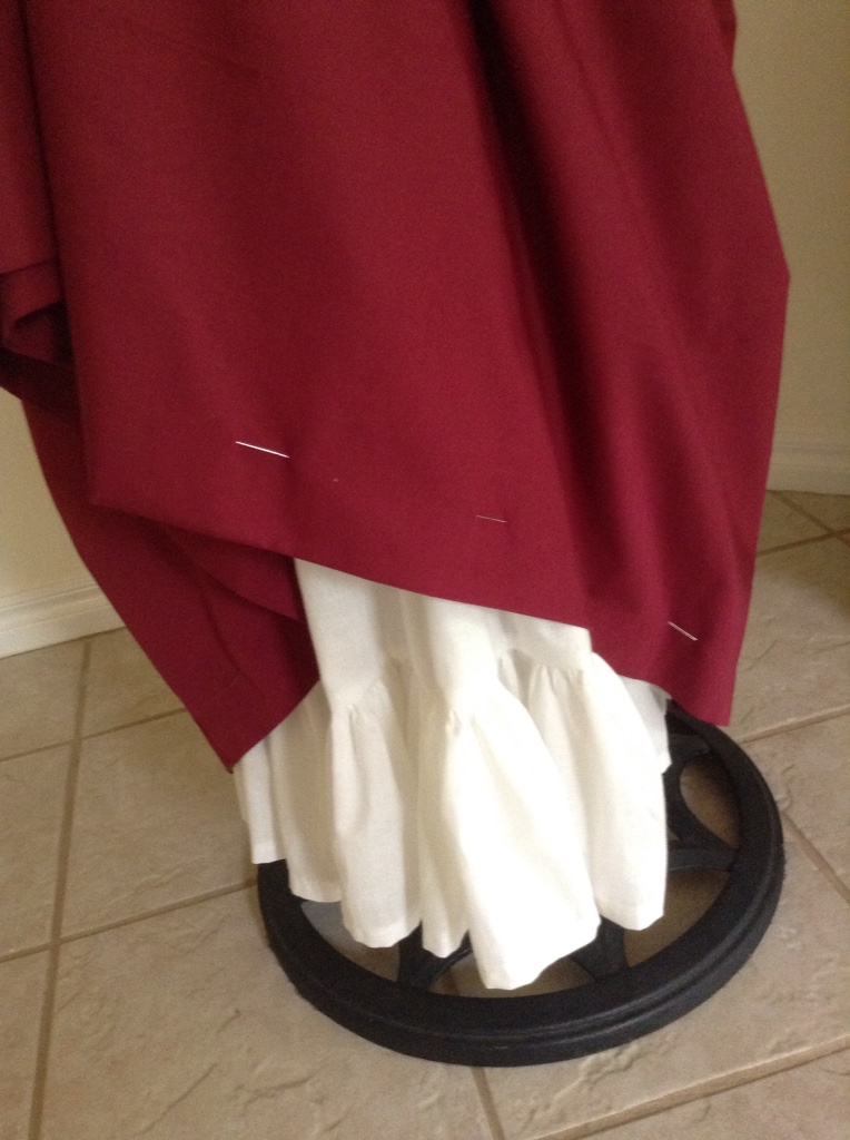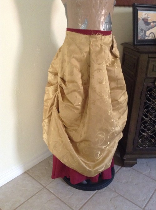 The overskirt is now taking shape with the gold skirt finished, it is waiting on the teal and burgundy chiffon overlay.