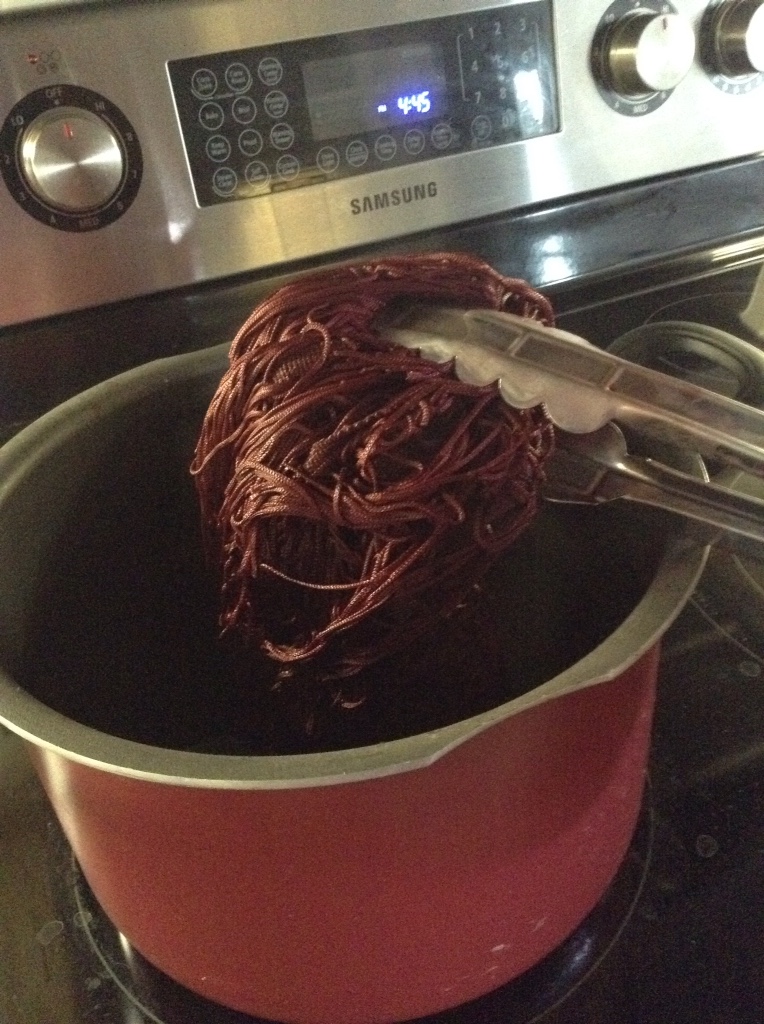Cut 1 small sample, put on pot of water/dye solution, boil said piece for 15mins. Ahh success! It is a deeper colour and more in tune with the chiffon and bodice fabric. Yippee!